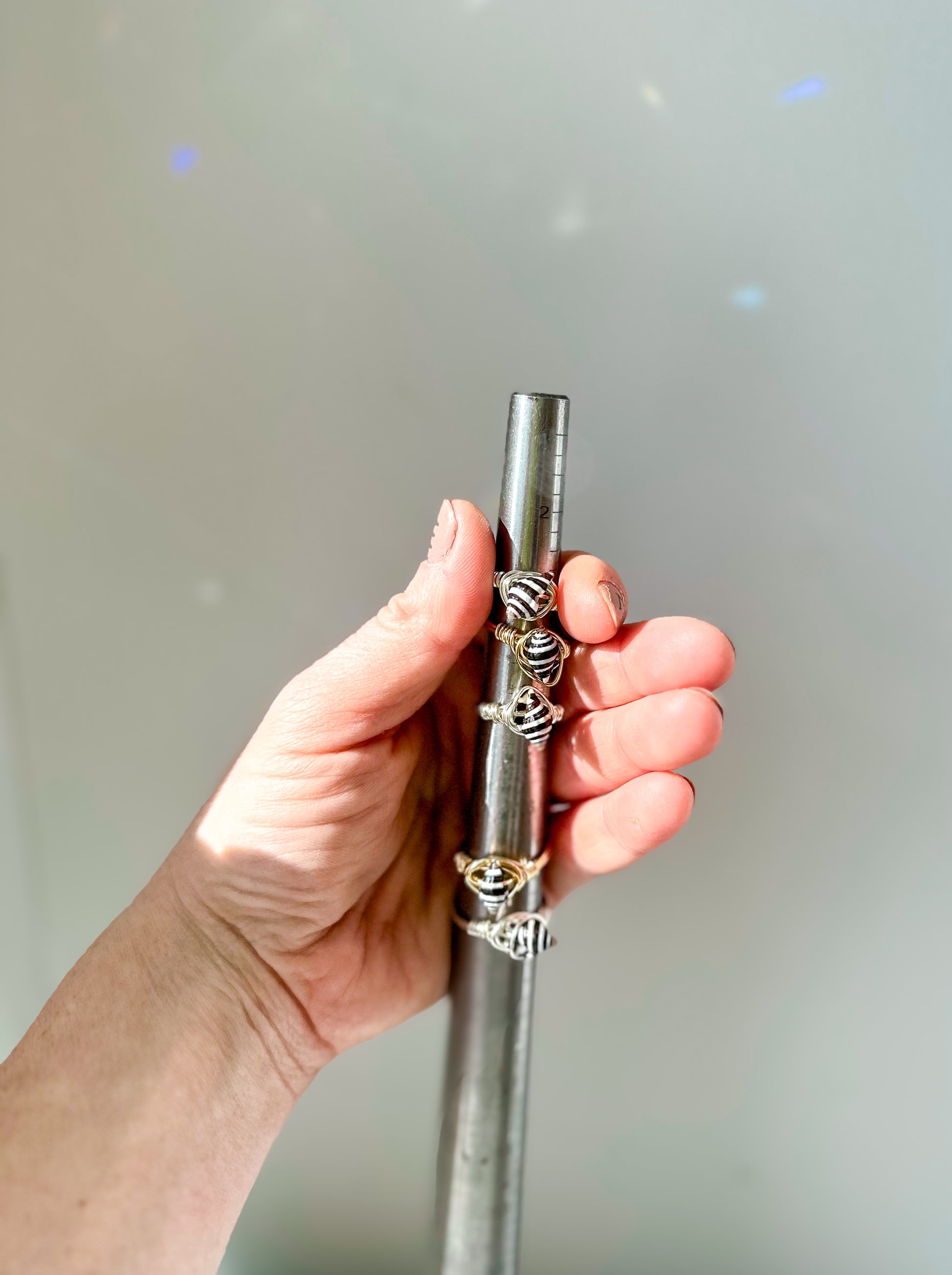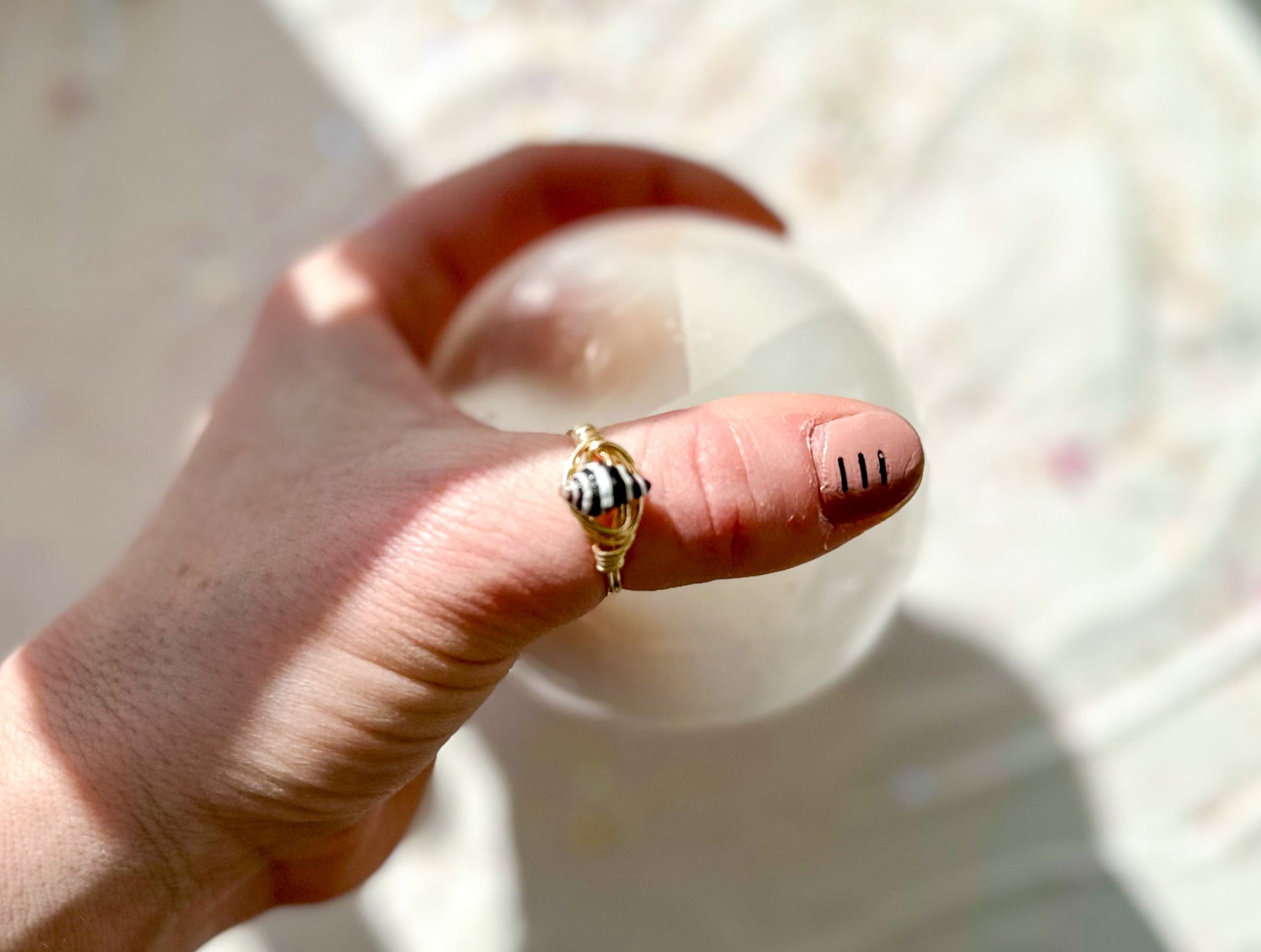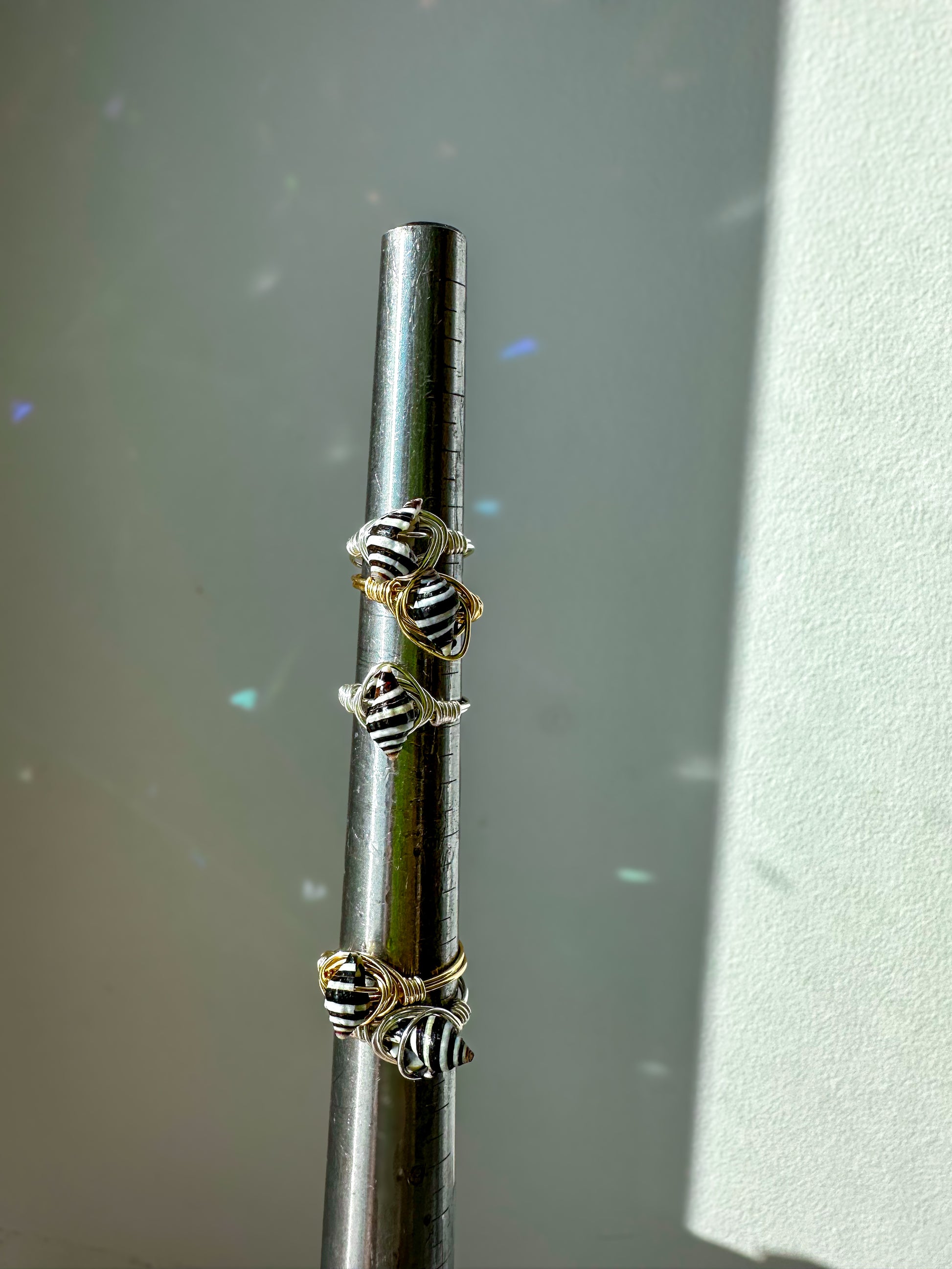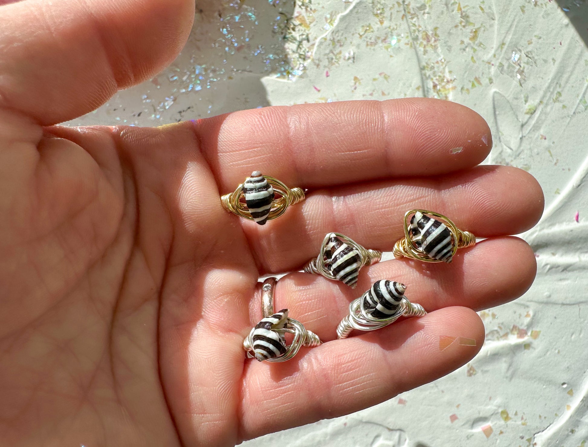 Add a touch of ocean vibes to your style with our Bumble Bee Shell Wire Wrapped Ring. Featuring funky stripes and a unique sea shell design, this coastal accessory is sure to warm up your winter wardrobe. Available in sizes 4-10 and made with hypoallergenic, lead and nickel free plated wires. Buzz-worthy fashion for all!