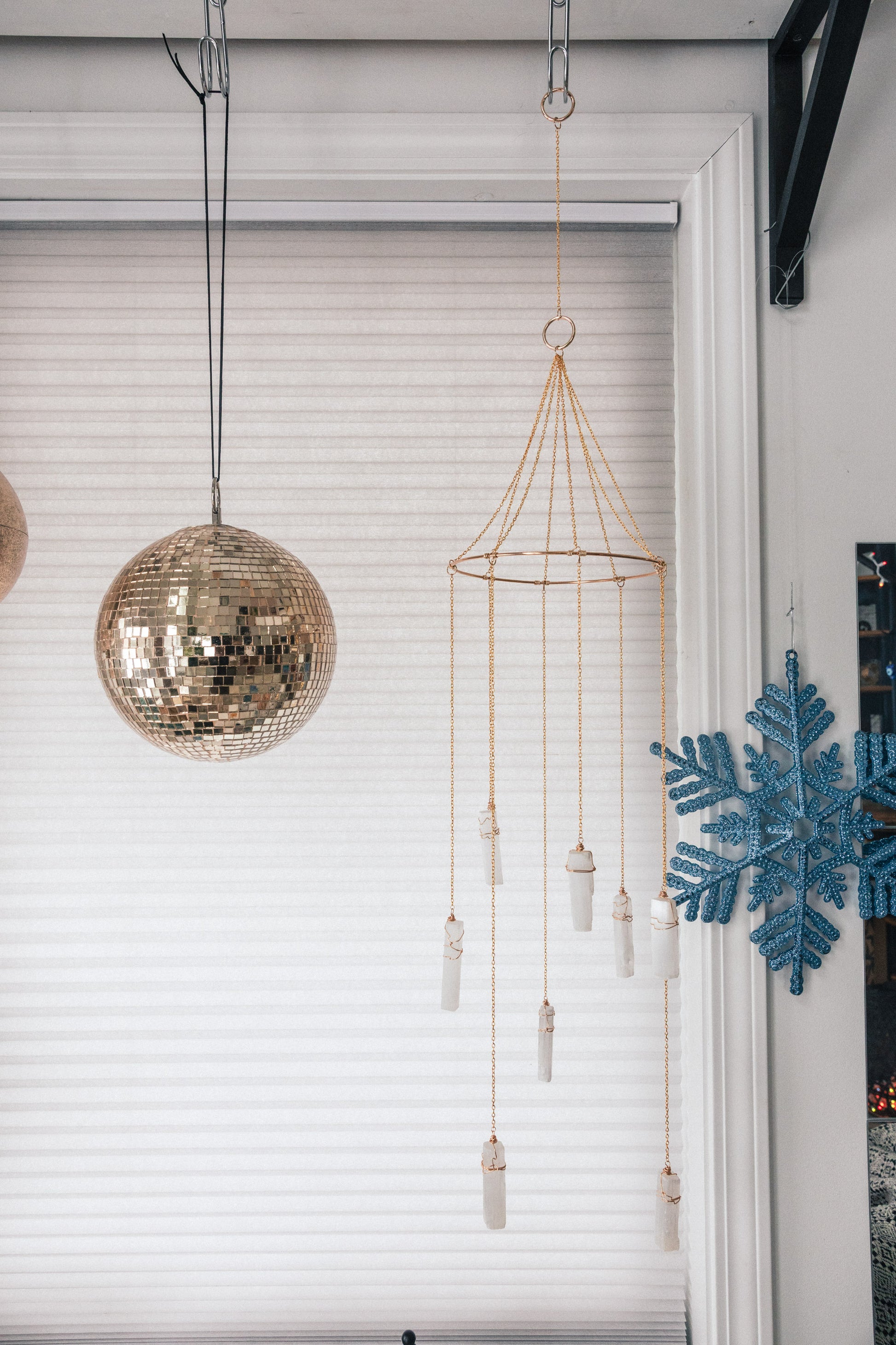 This one-of-a-kind Quartz Crystal mobile, handcrafted by Elise Marie DeSigns, adds a boho touch to any room, especially a nursery! The Selenite crystals shine and bring a lively and energizing element to any space.
