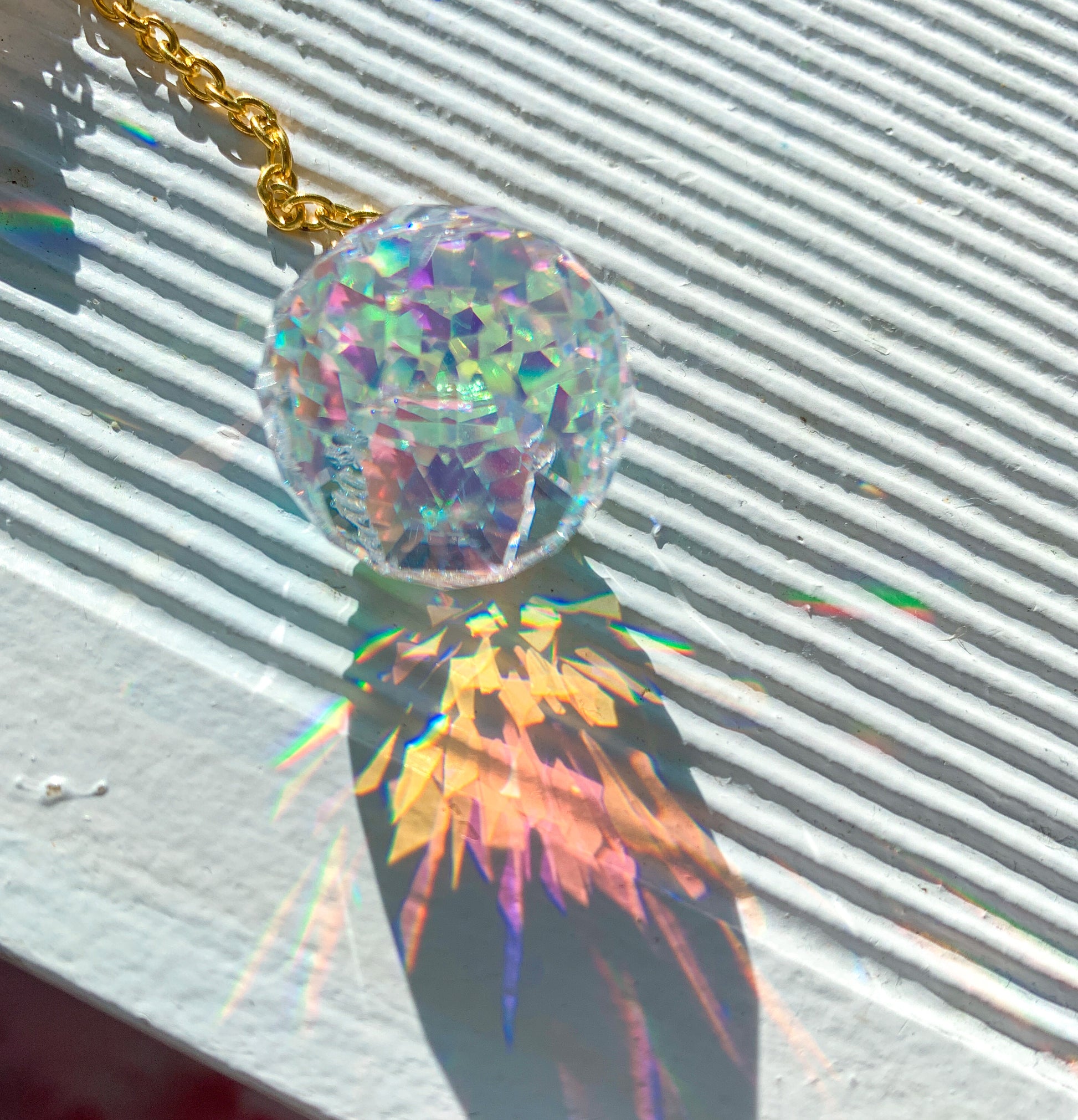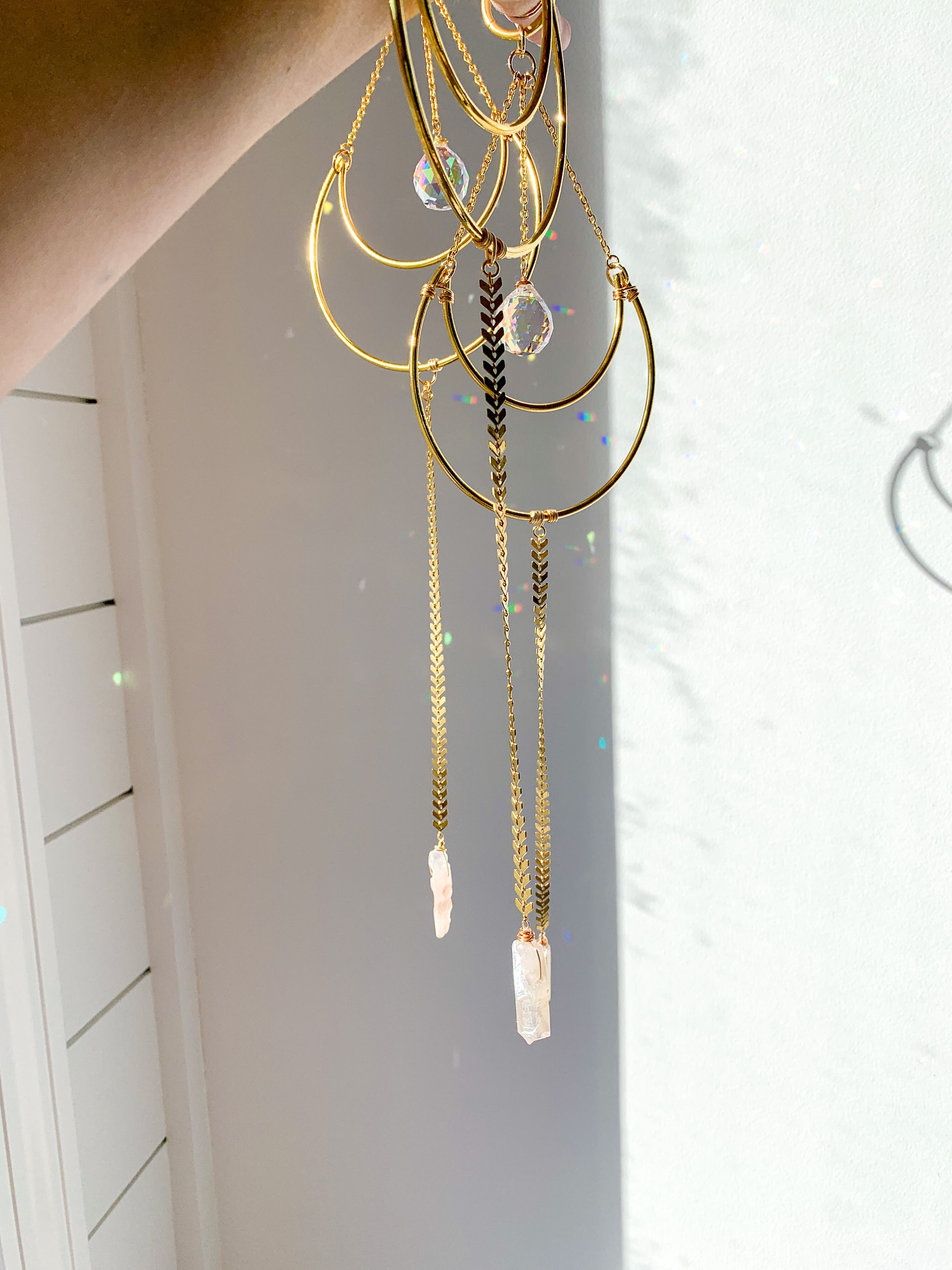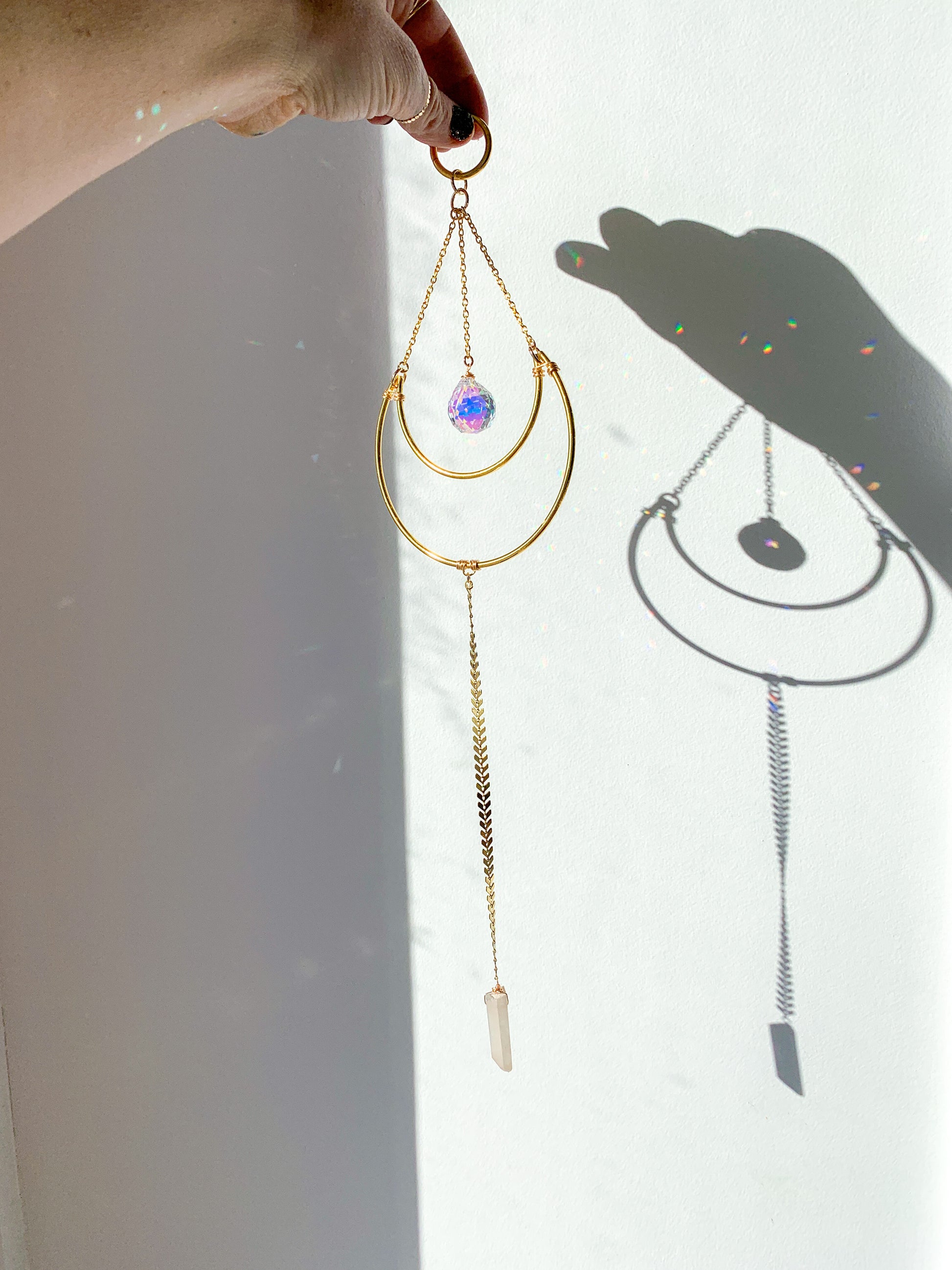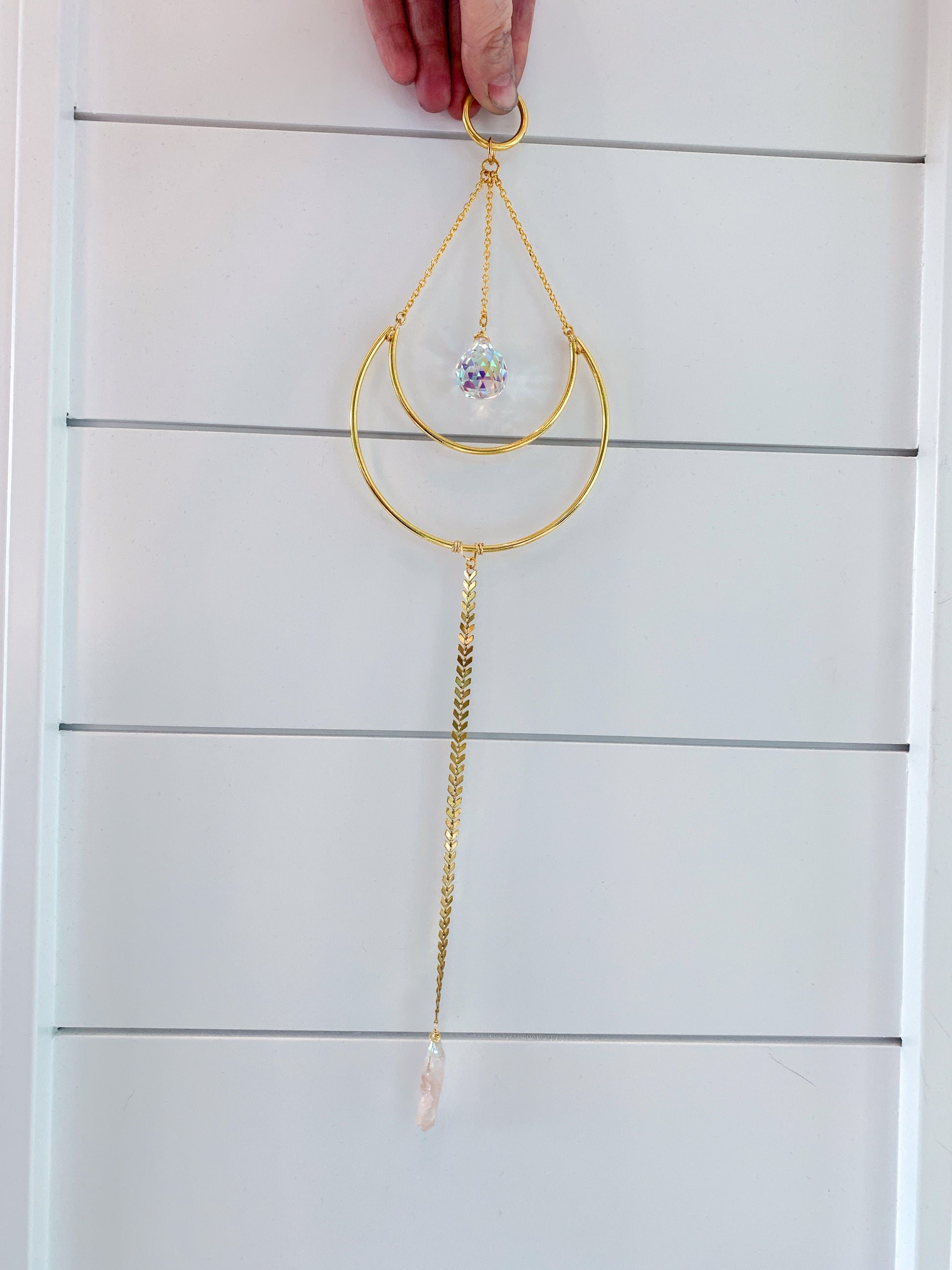 This lovely crystal suncatcher adds a little bit of sparkle to any room. When the sun hits it, it sends rays of light throughout the room, creating a rainbow against almost any surface. Featuring a small crystal ball hanging from a delicate chain at the top, and a raw rose quartz hanging from a fishbone chain at the bottom.