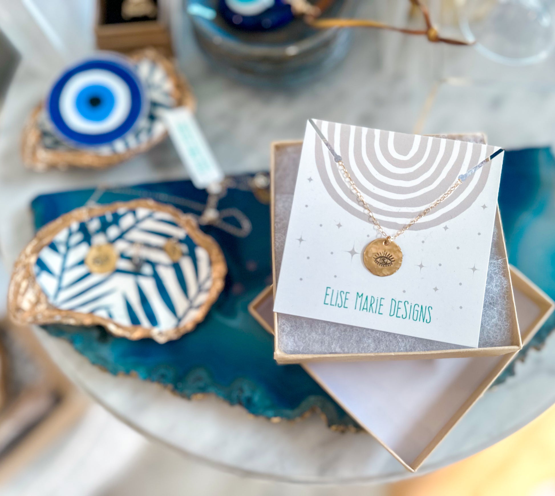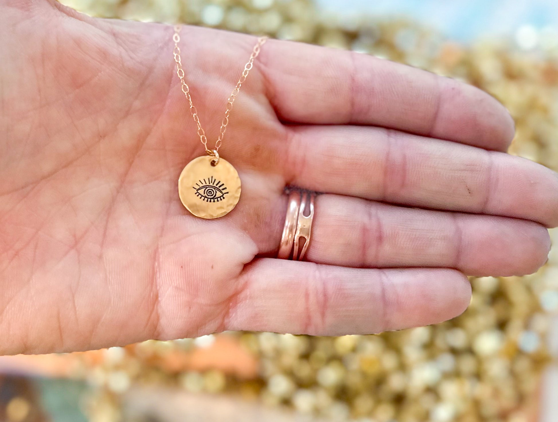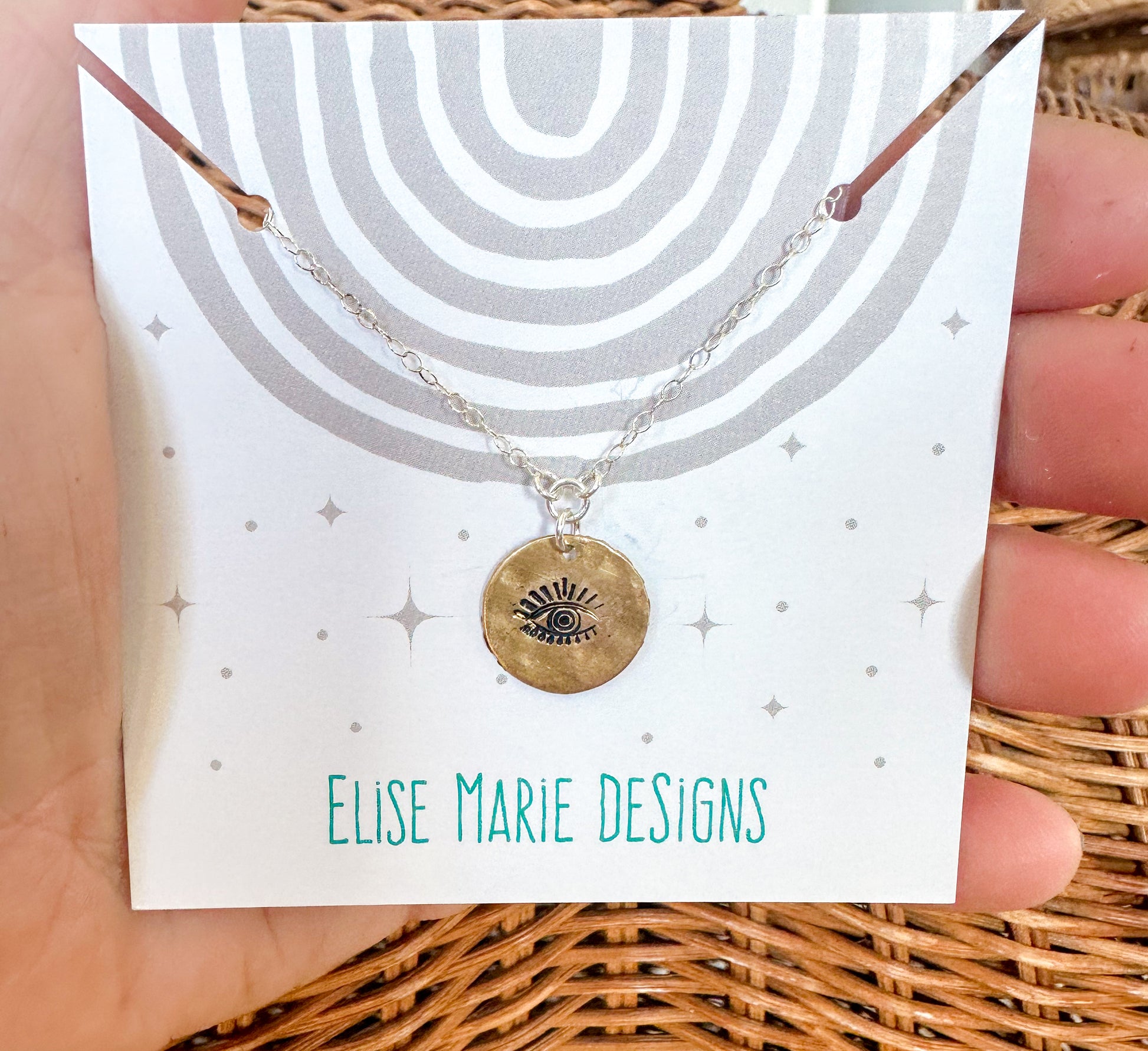 Ward off evil with this chic necklace featuring a hand-stamped brass charm of an eye symbol. Perfect for everyday wear, this dainty piece is available in gold-filled or sterling silver and is hypoallergenic. Brace yourself (and your outfit) with this protective accessory!