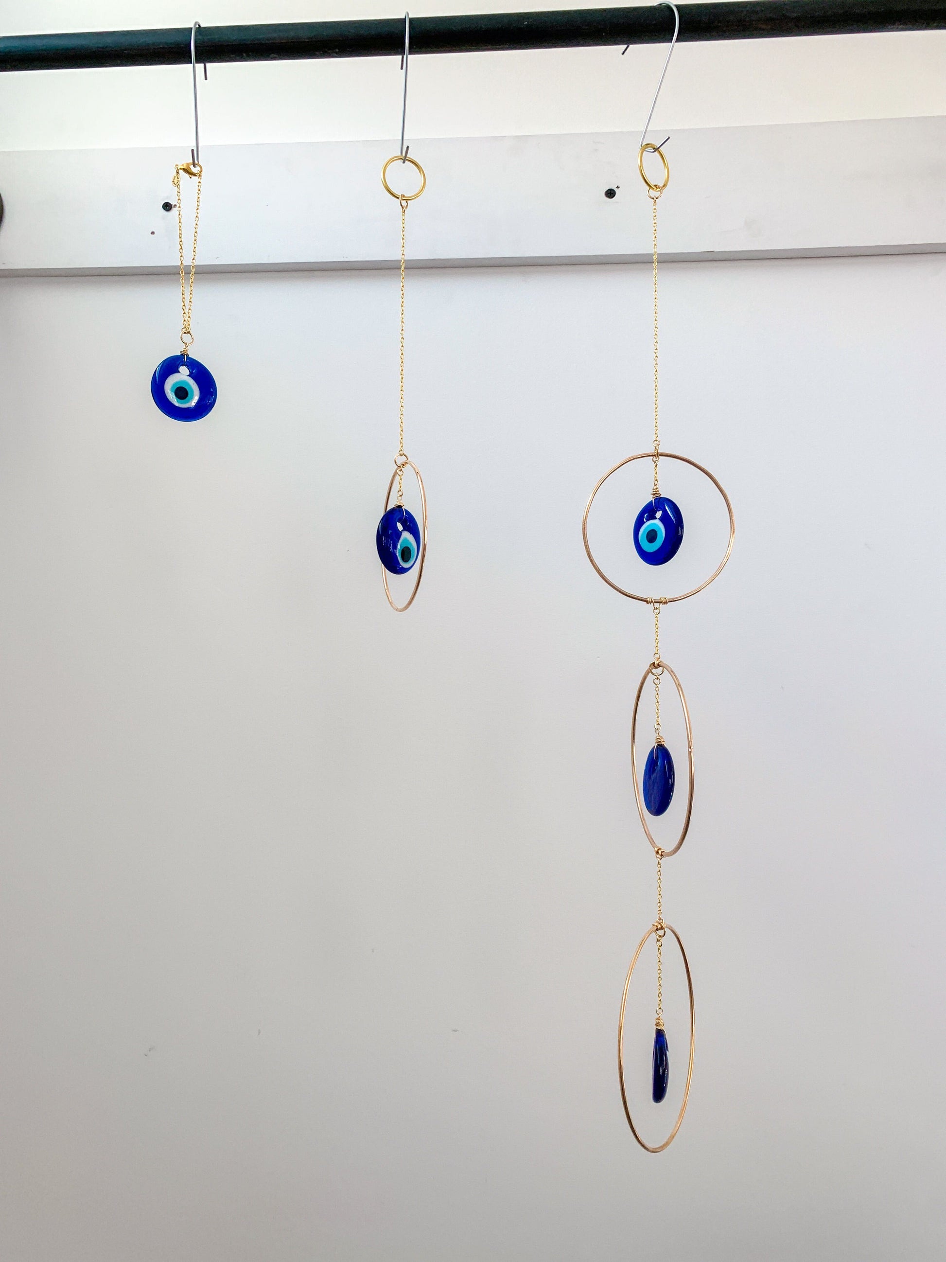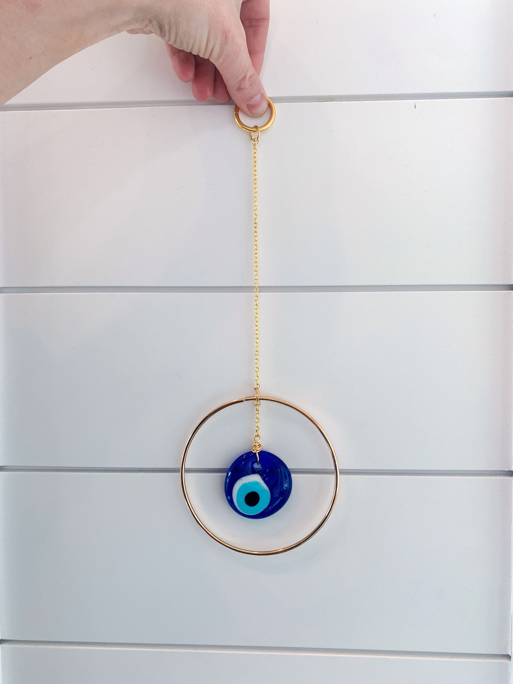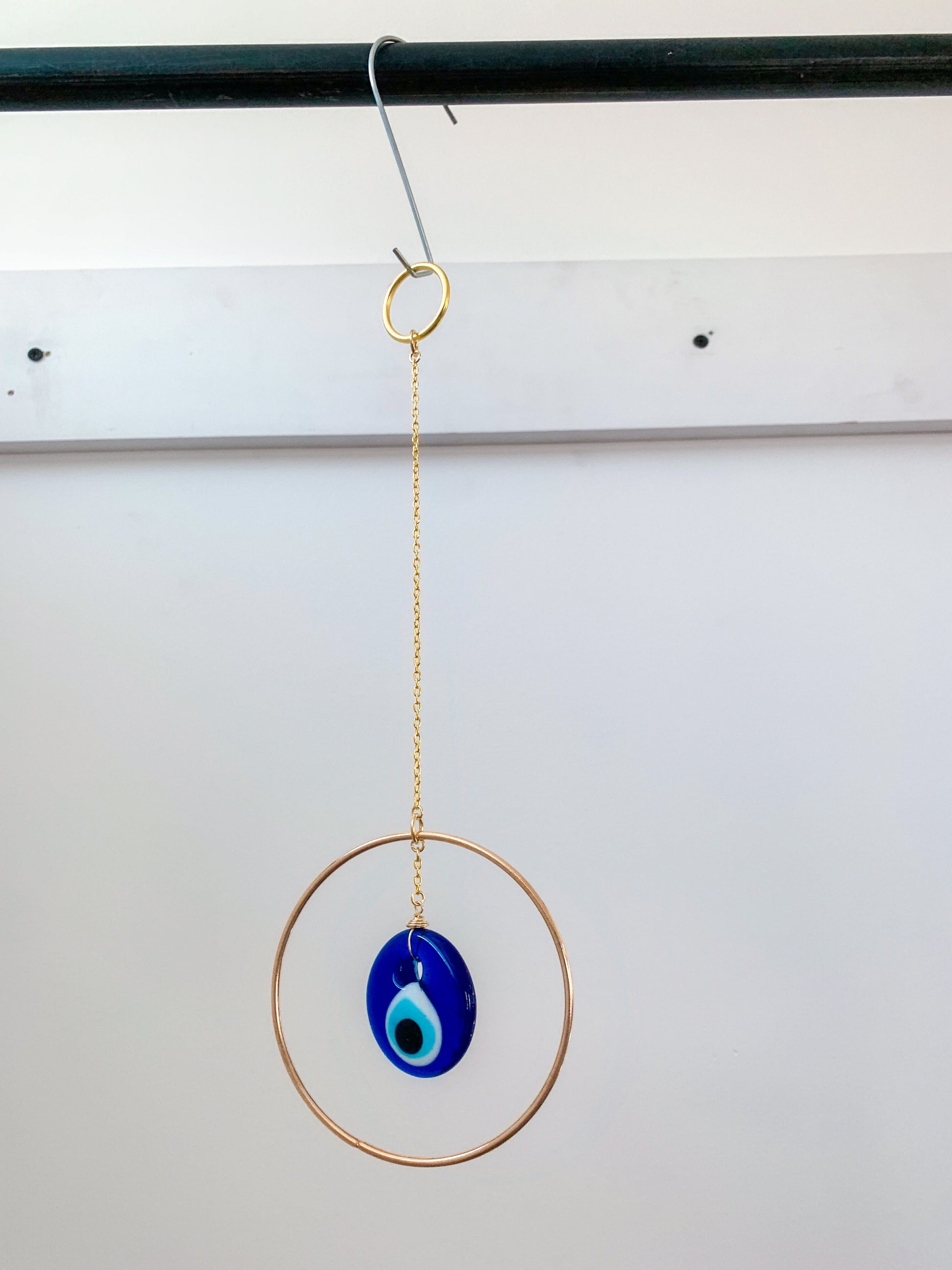 With a large circle closure at the end for easy hanging from a nail or hook, this wall hanging featuring a single glass Evil Eye bead in a halo arrangement is a perfect addition to any space needing a little extra intentional protection.