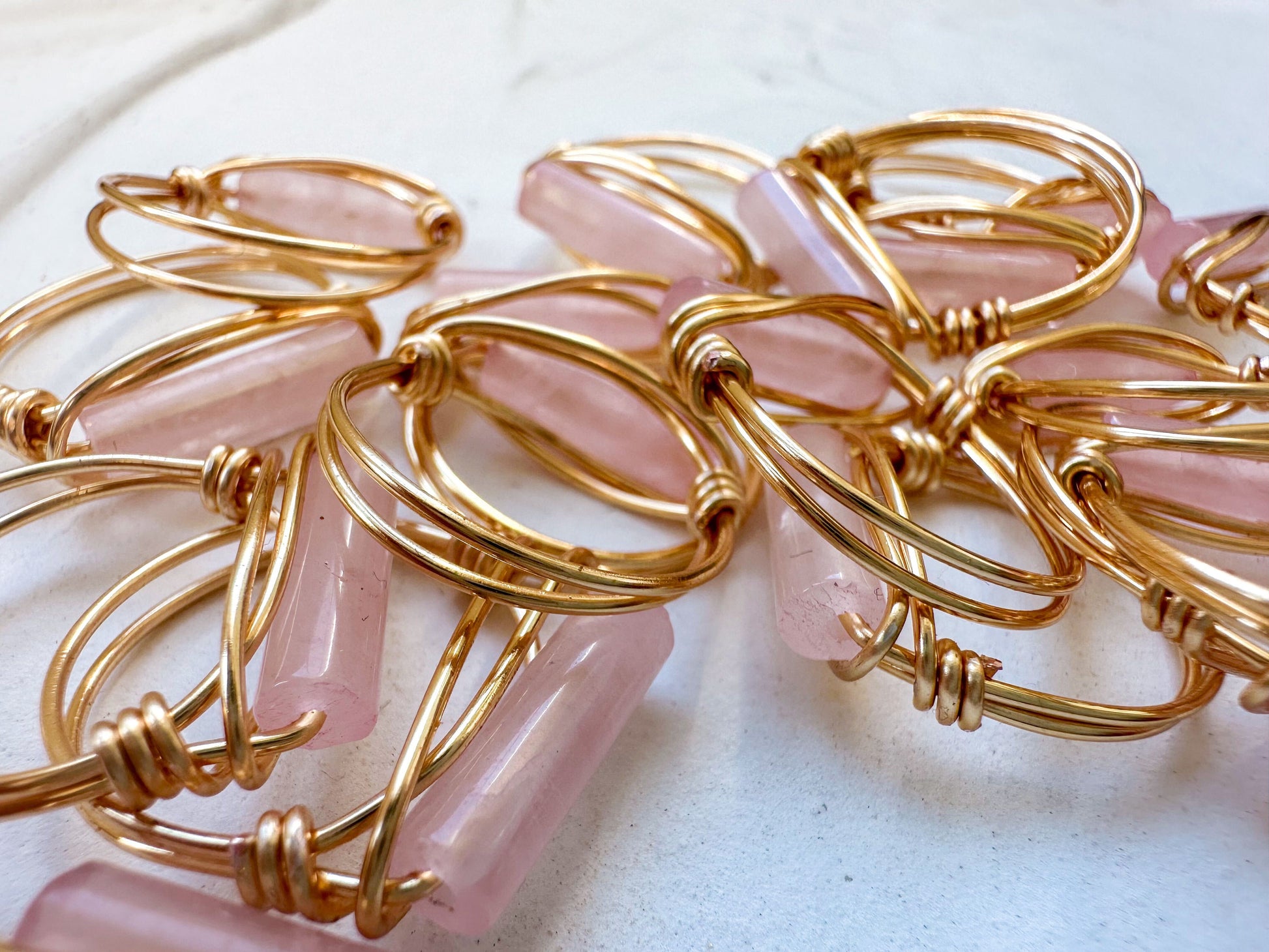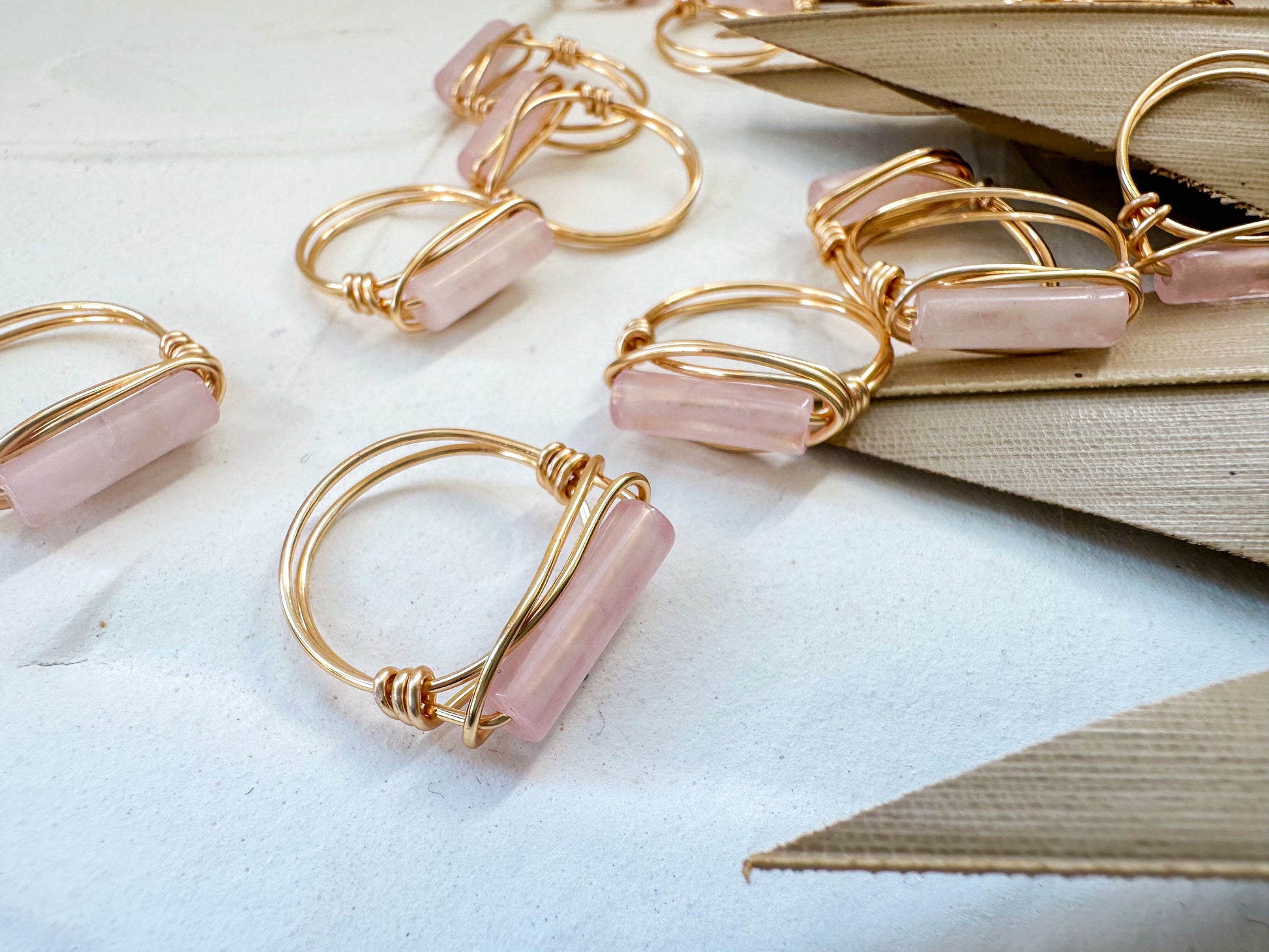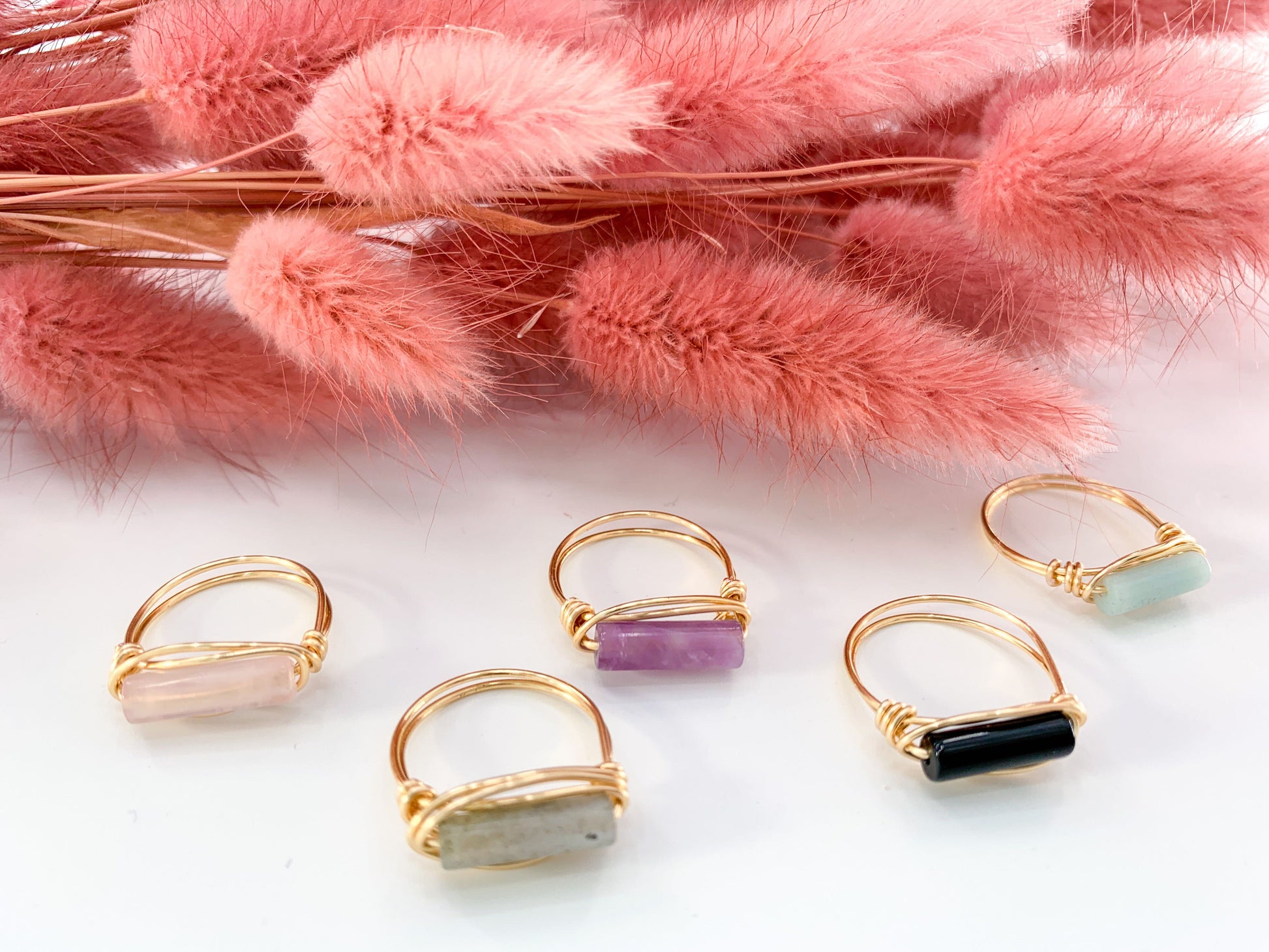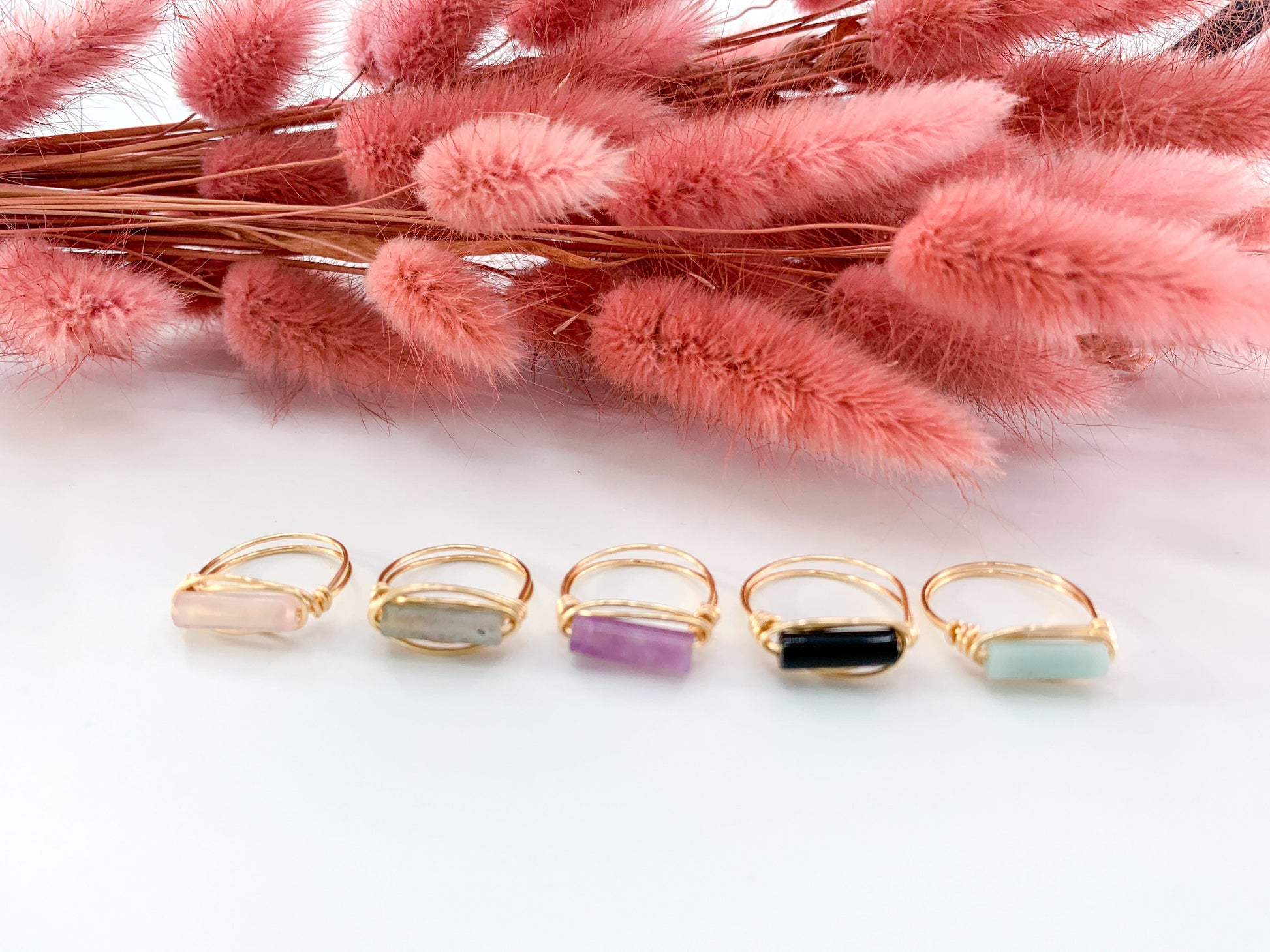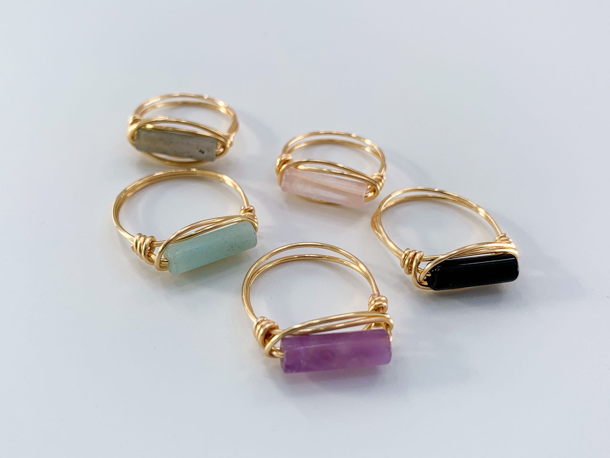 With a Gemstone Tube Bead circled with wire wrapping, these eye-catching rings are hand-wrapped and are made-to-order. Both delicate and uniquely modern, they will compliment any outfit. Choose the size and gemstone color that fits you and your style.