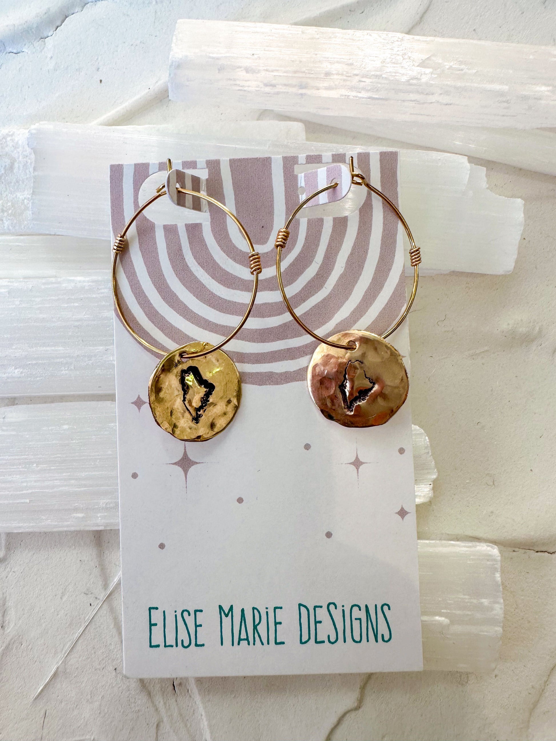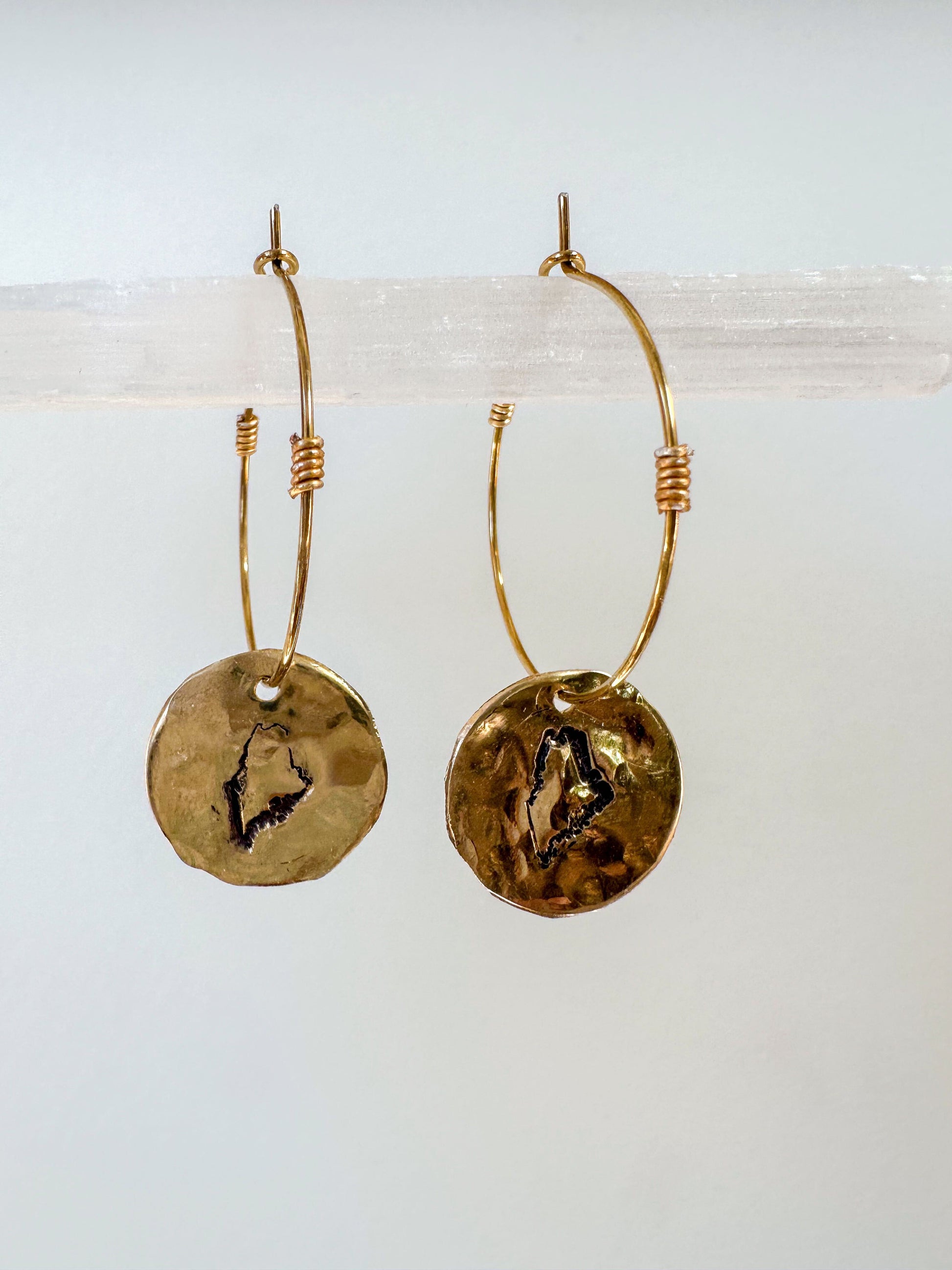 Celebrate your favorite New England state with these charming hoops, hand-crafted and stamped for a personalized touch. Versatile enough for everyday wear, these 2.25" earrings are sure to show your state pride. Choose from silver or gold stainless steel hoops, both lead and nickel free for a hypoallergenic option.
