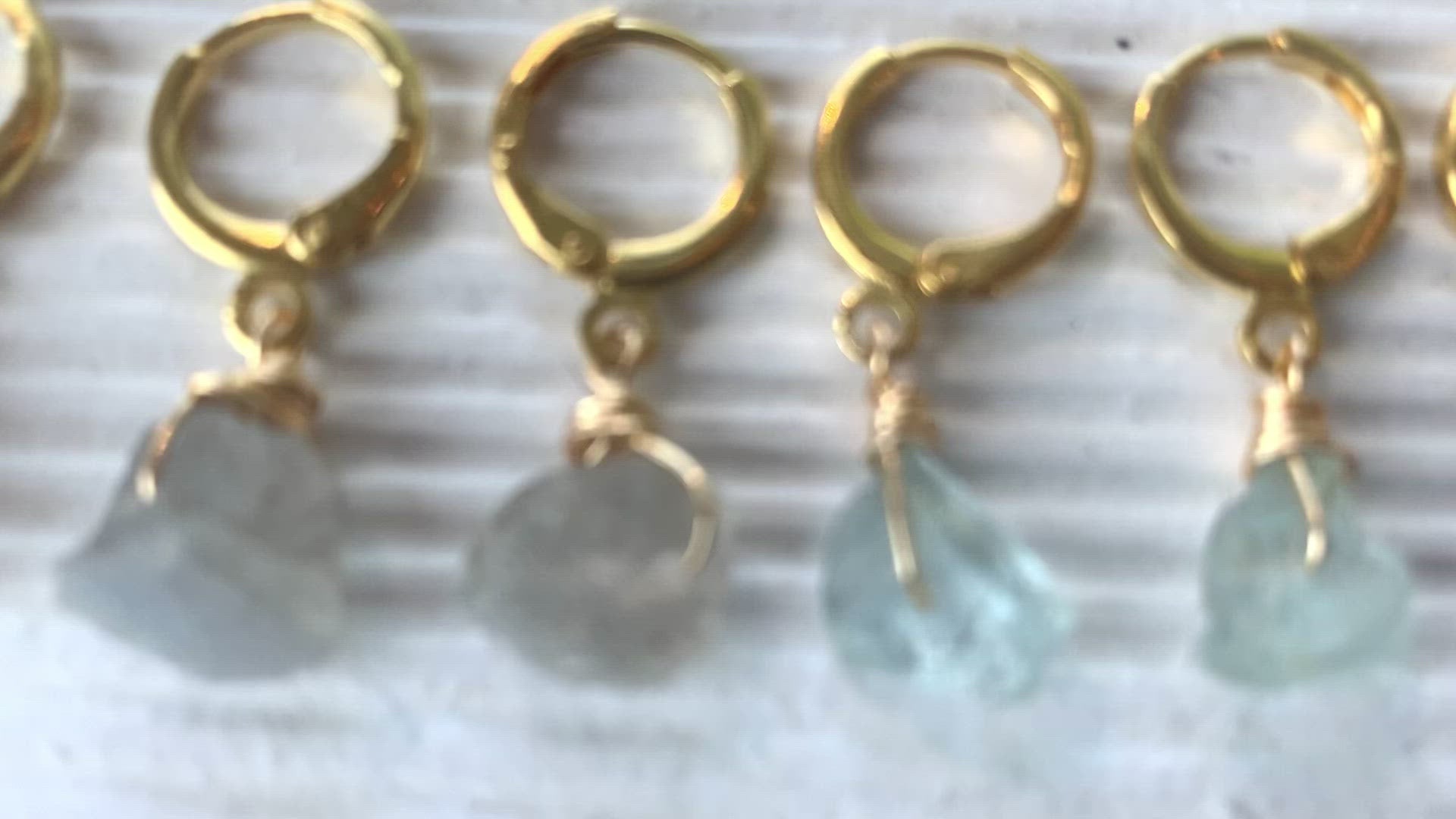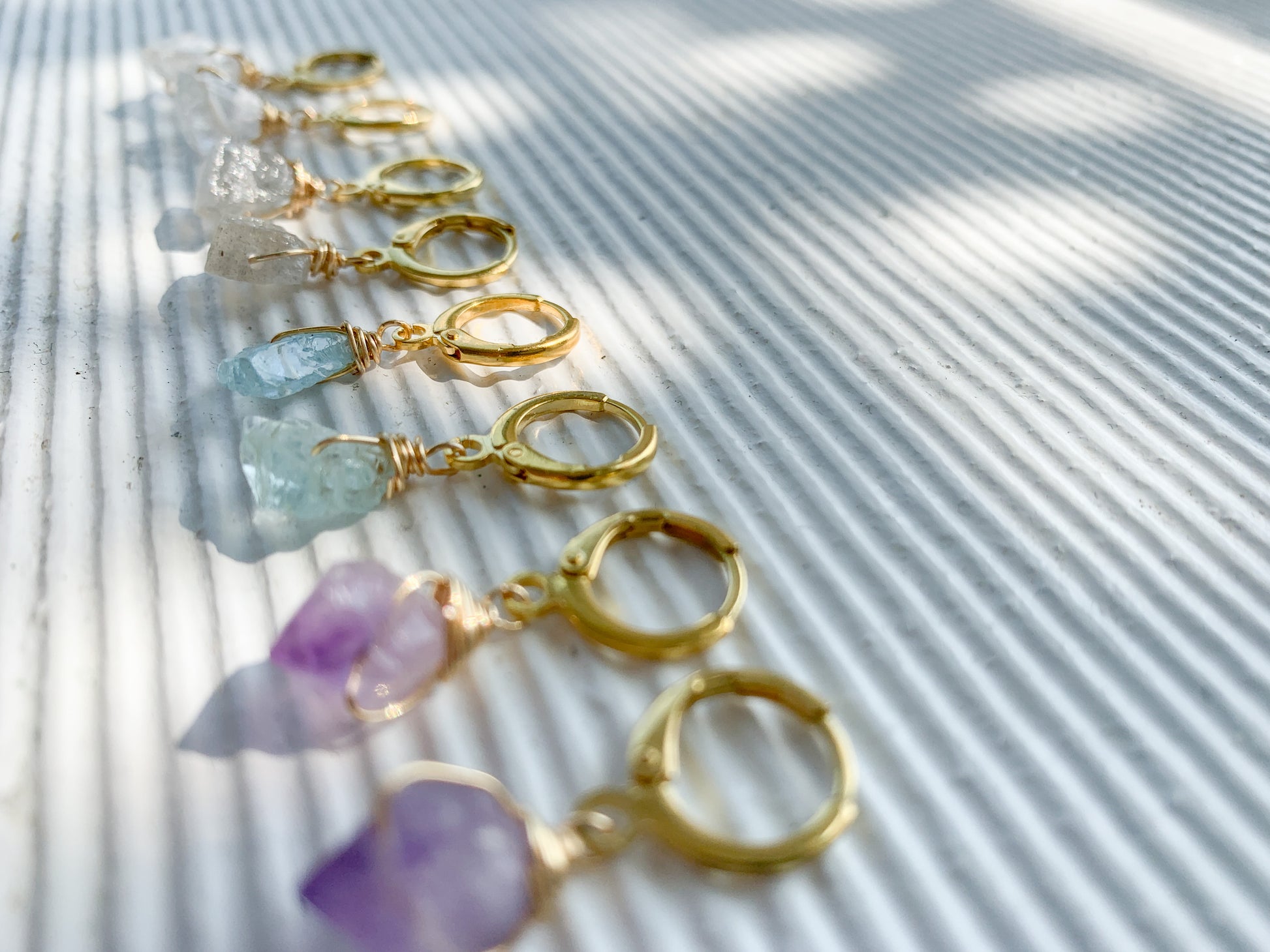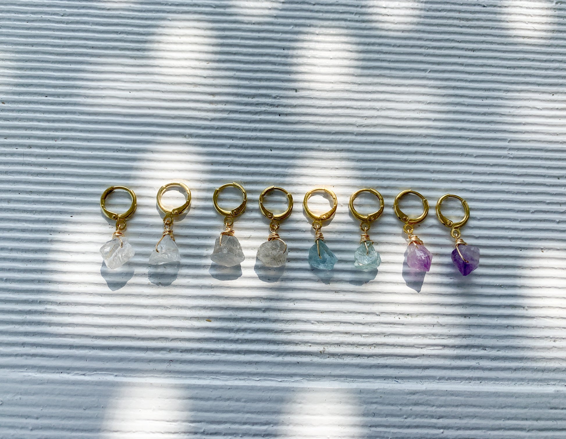 New addition to our earring wire collection - huggie earrings are small hoops that "hug" and sit close to your earlobe. These new huggies accompany a small raw gemstone. Each of these earrings are made-to-order - select the earring color that matches your personal style. See reference photos for huggie metal colors and raw gemstone choices.