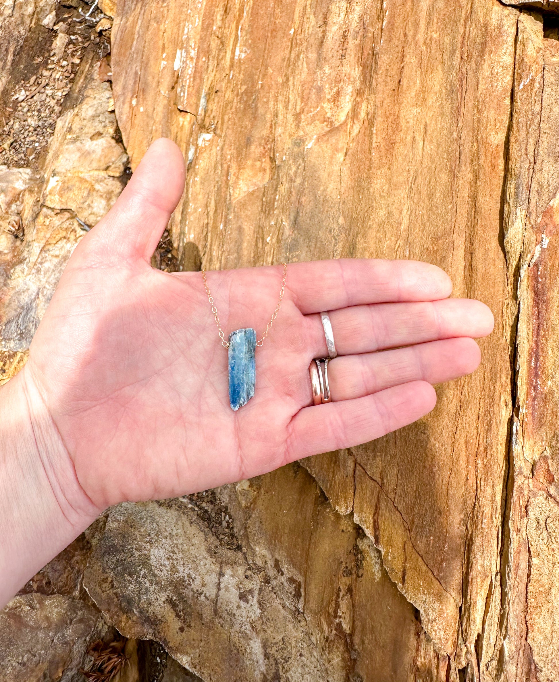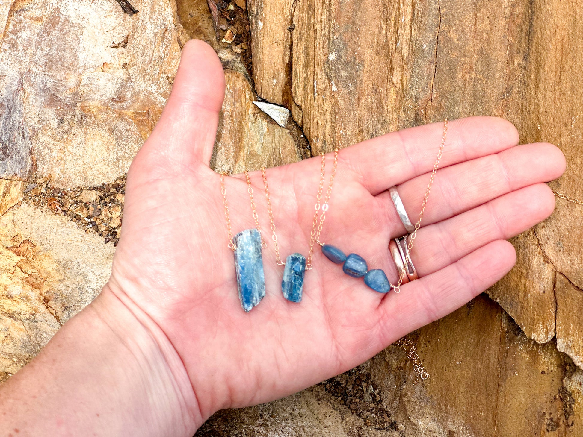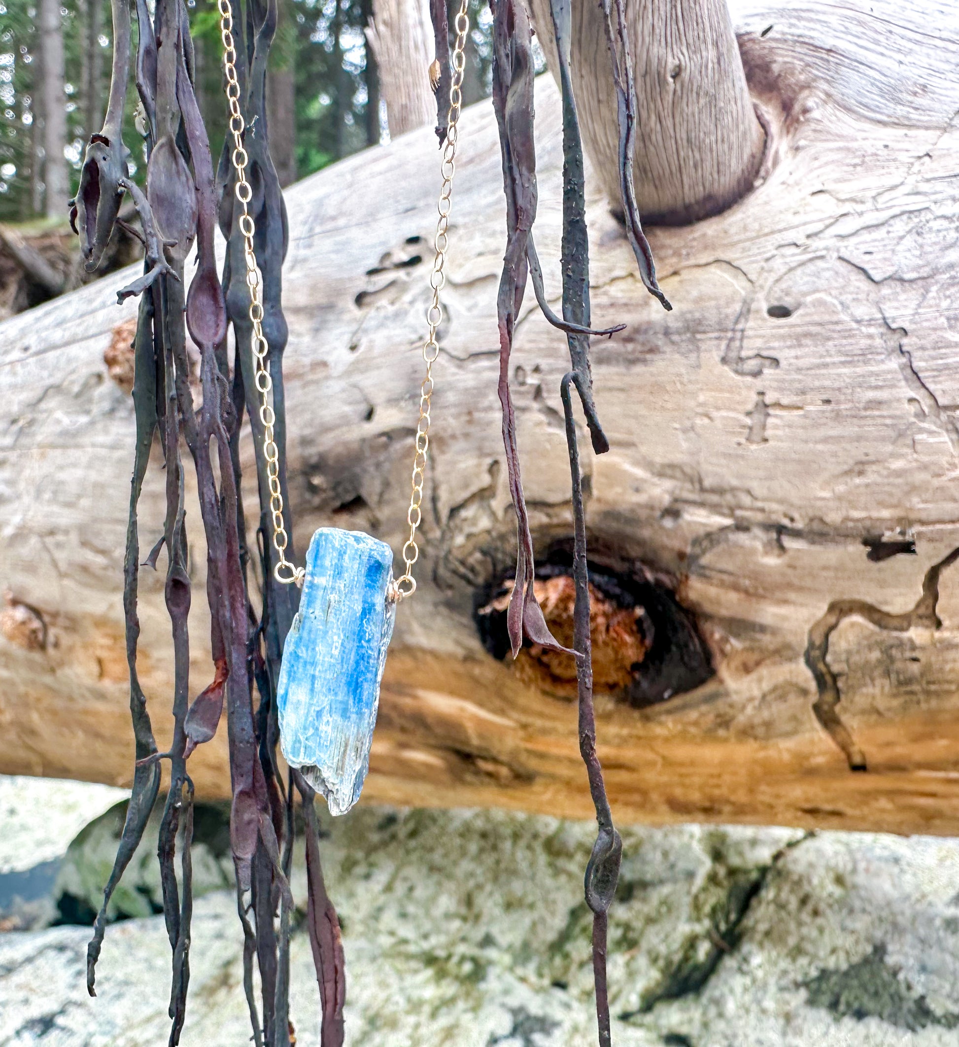Add a pop of color to your outfit and feel grounded with our Kyanite Point Necklace! With its striking blue hue and simplistic design, this dainty necklace is perfect for any occasion. Show off your unique sense of style and stand out from the crowd.