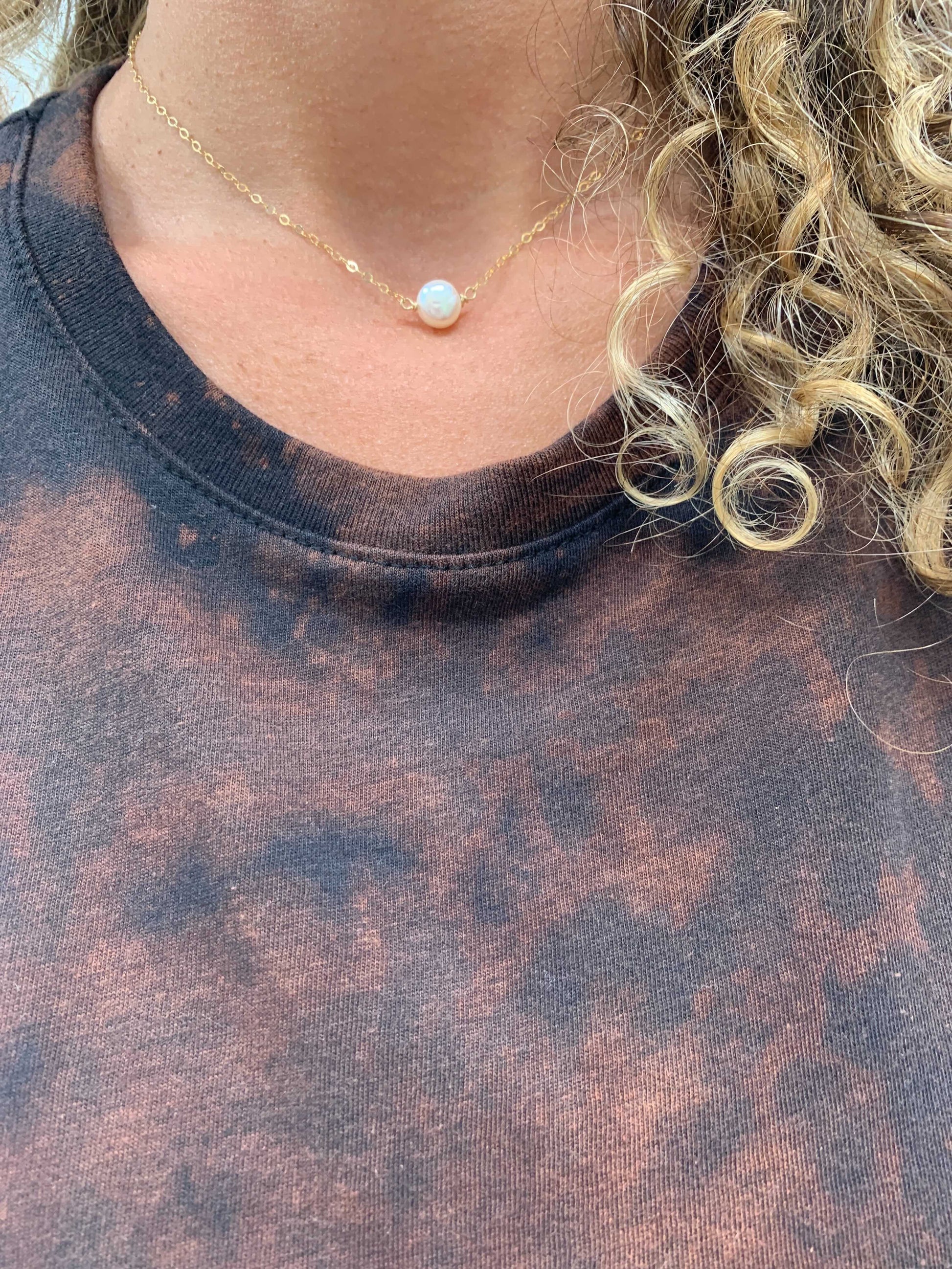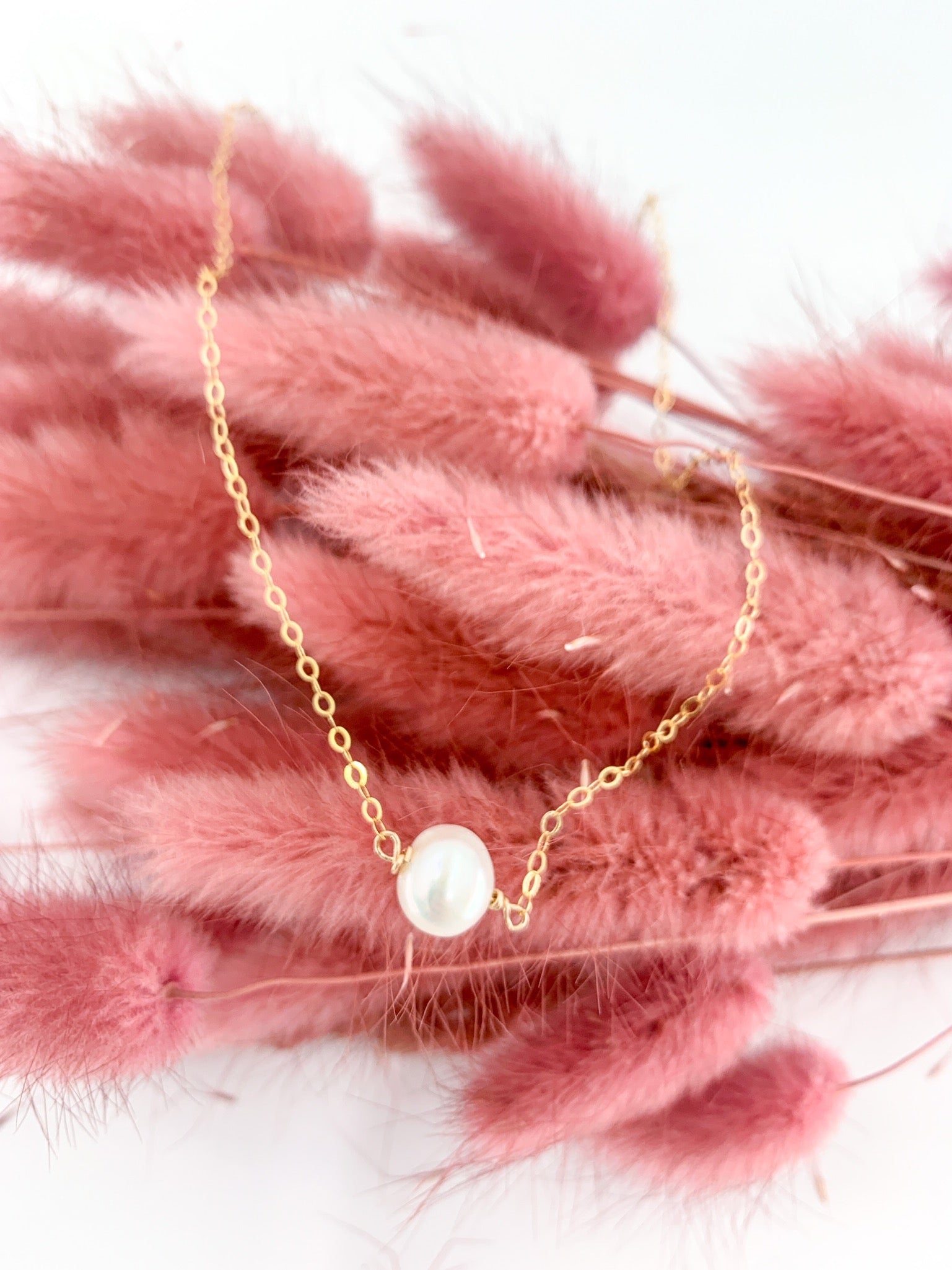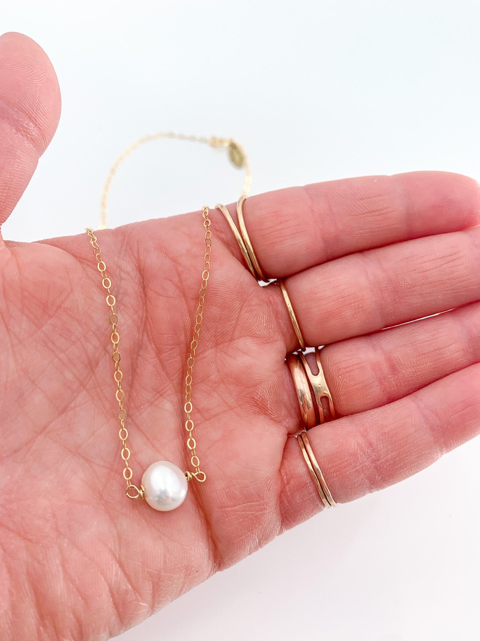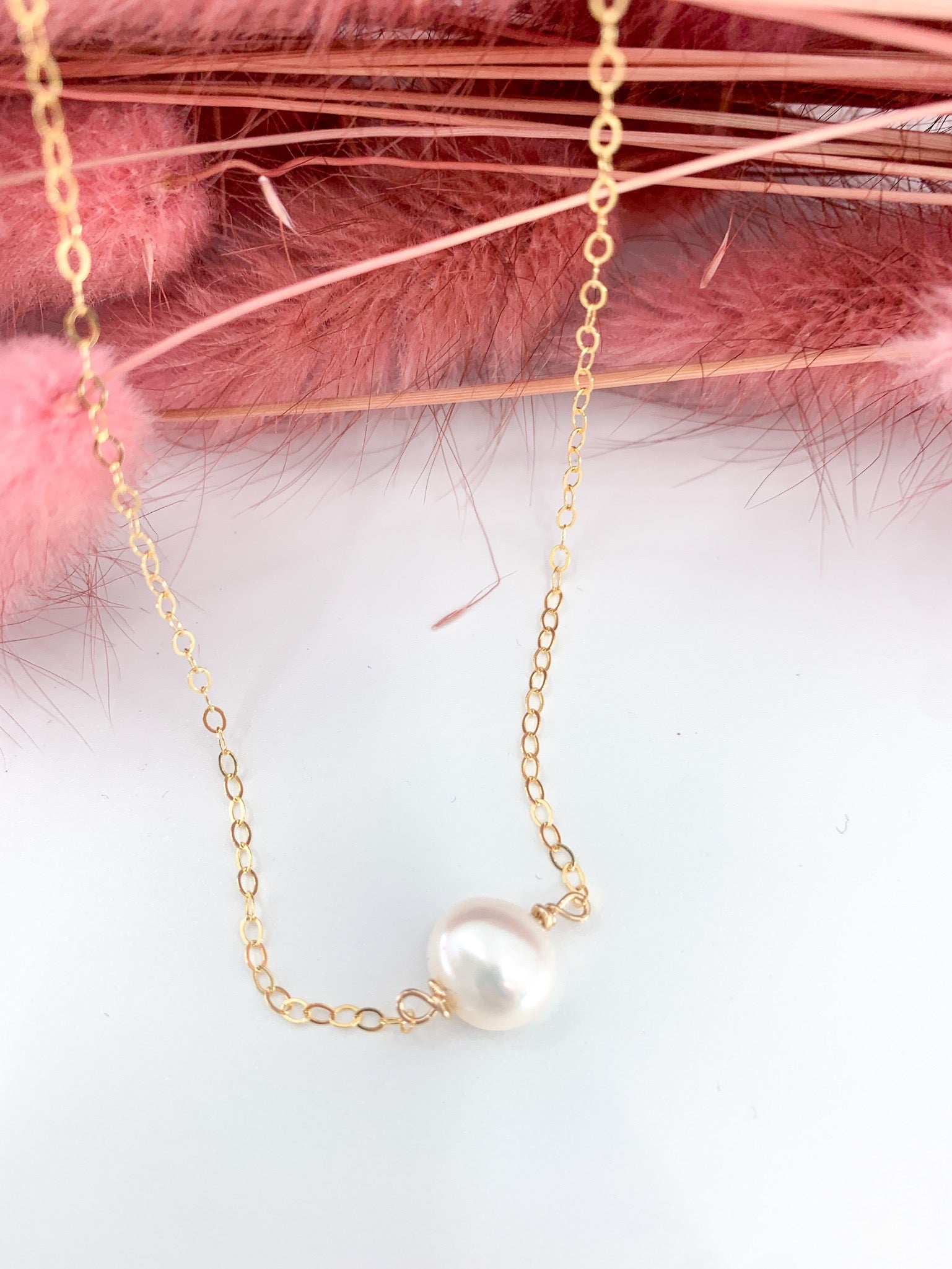 This necklace features a single Baroque Pearl and is great for layering. Each necklace is made-to-order so you can customize the chain color to match your personal style!