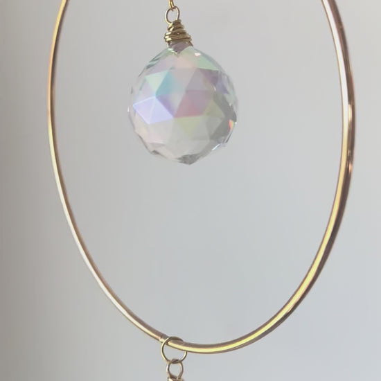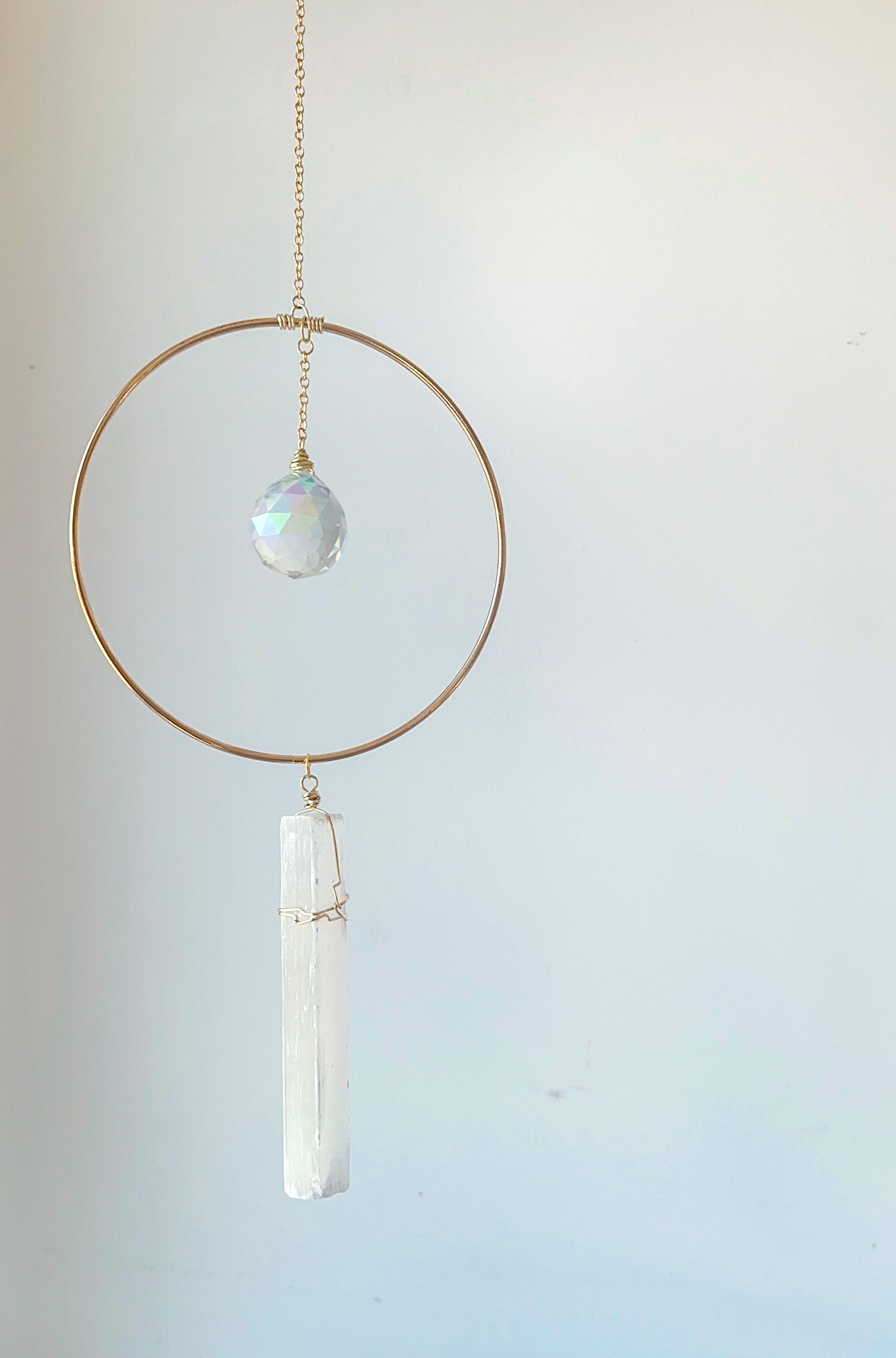 A sun catcher prism dangles inside a gleaming gold ring suspended from a chain, with a small 6-8" selenite stick hanging from the ring. This 16" beauty catches light to sprinkle rainbows and spread cheerful vibes!
